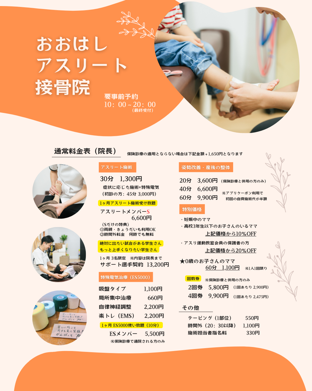 万が一のケガの際はいつでも対応致します。 休診日がある際はInstagramやGoogleにてお知らせしますのでご確認下さい。 |